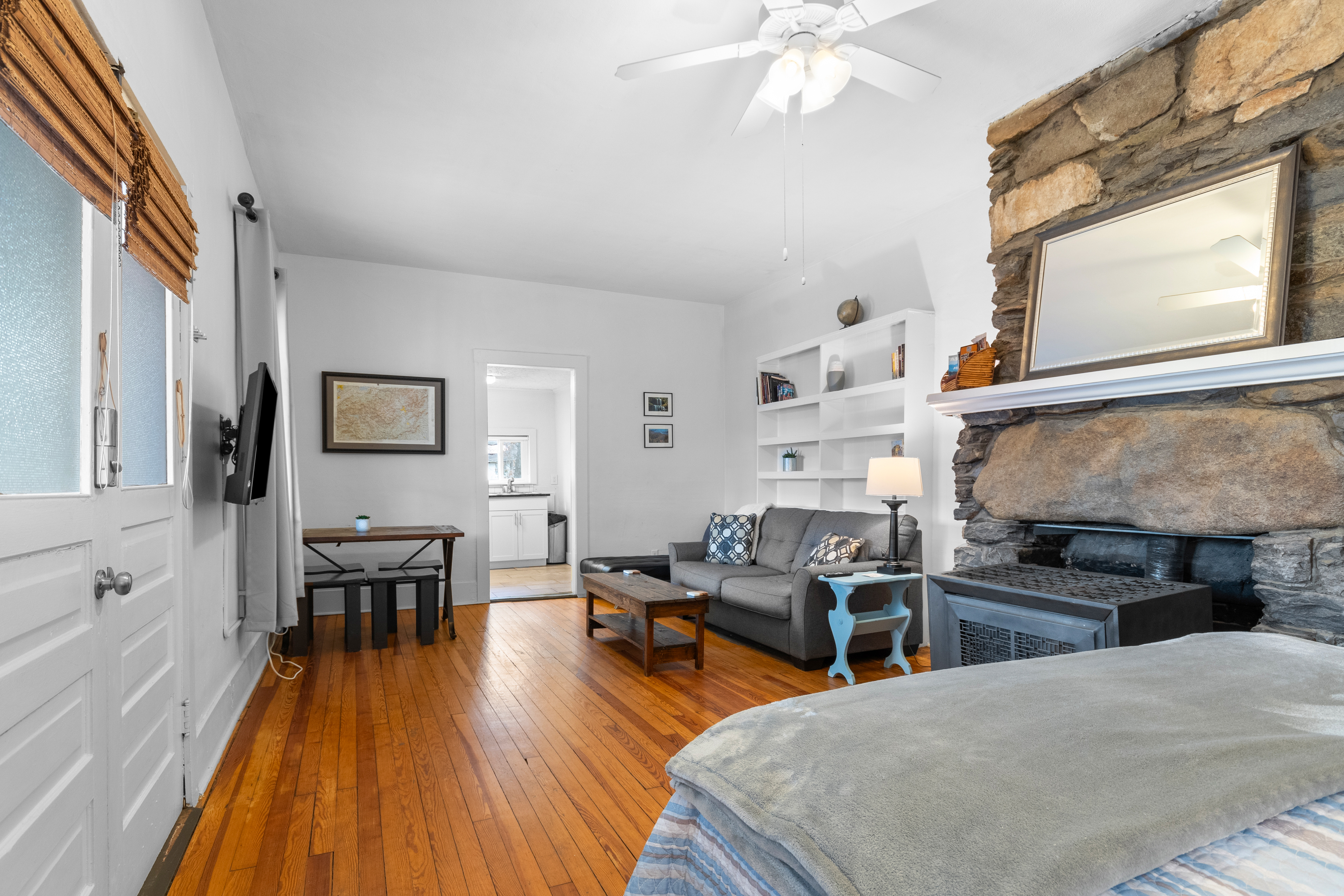 Black Mountain Lodge has five units, each with a separate entrance. The door for Unit 1 is in the center of the front porch. There are steps that lead up to the porch. Inside this 540 sq ft space you will find a beautiful suite consisting of a combined living and bedroom and featuring a dramatic stone fireplace with a gas heater on the hearth. The room is sunny and bright, and the hardwood floors add a warm feeling to the space. The full kitchen is well stocked with everything you need for preparing all of your meals, as well as a drip coffee maker. There is also a smart tv you can use to log into your streaming subscriptions, and complimentary WiFi. There is 1 bed for sleeping up to 2 guests. We do not have a sleeper sofa. Due to fire zoning regulations we cannot allow cots or air mattresses on the floor. This is a non smoking property. This home is over 100 years old and sits among large, old trees. Unfortunately due to this setting, insects will often make their way into the home. We welcome pets, and if you bring one please be considerate of other groups in the building. Please no dogs that bark if you are away. Dogs must be in a crate if left alone. Keep dogs on a leash at all times. Thanks!