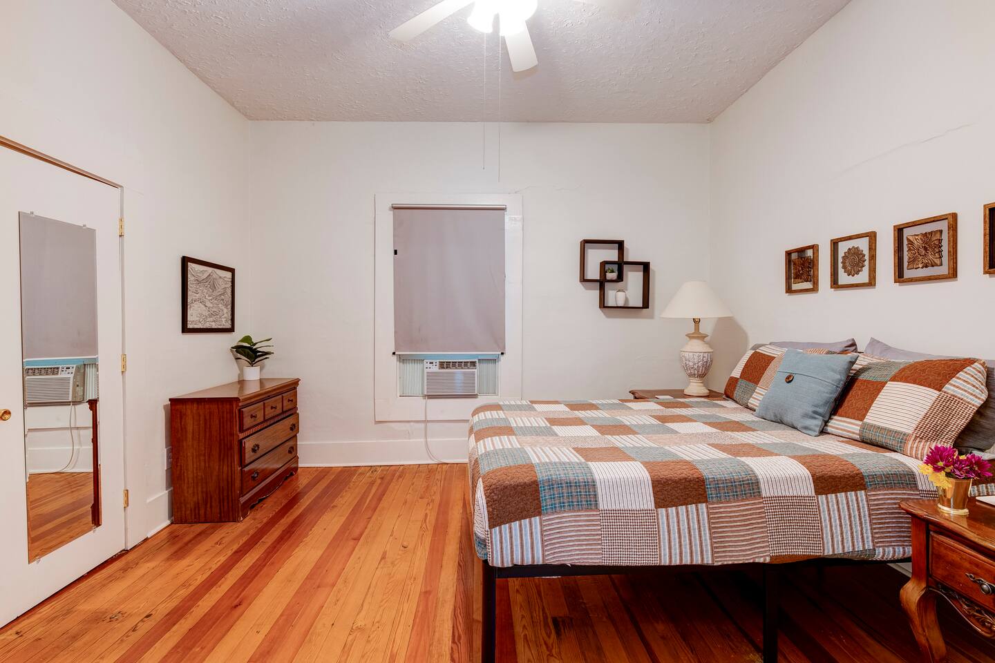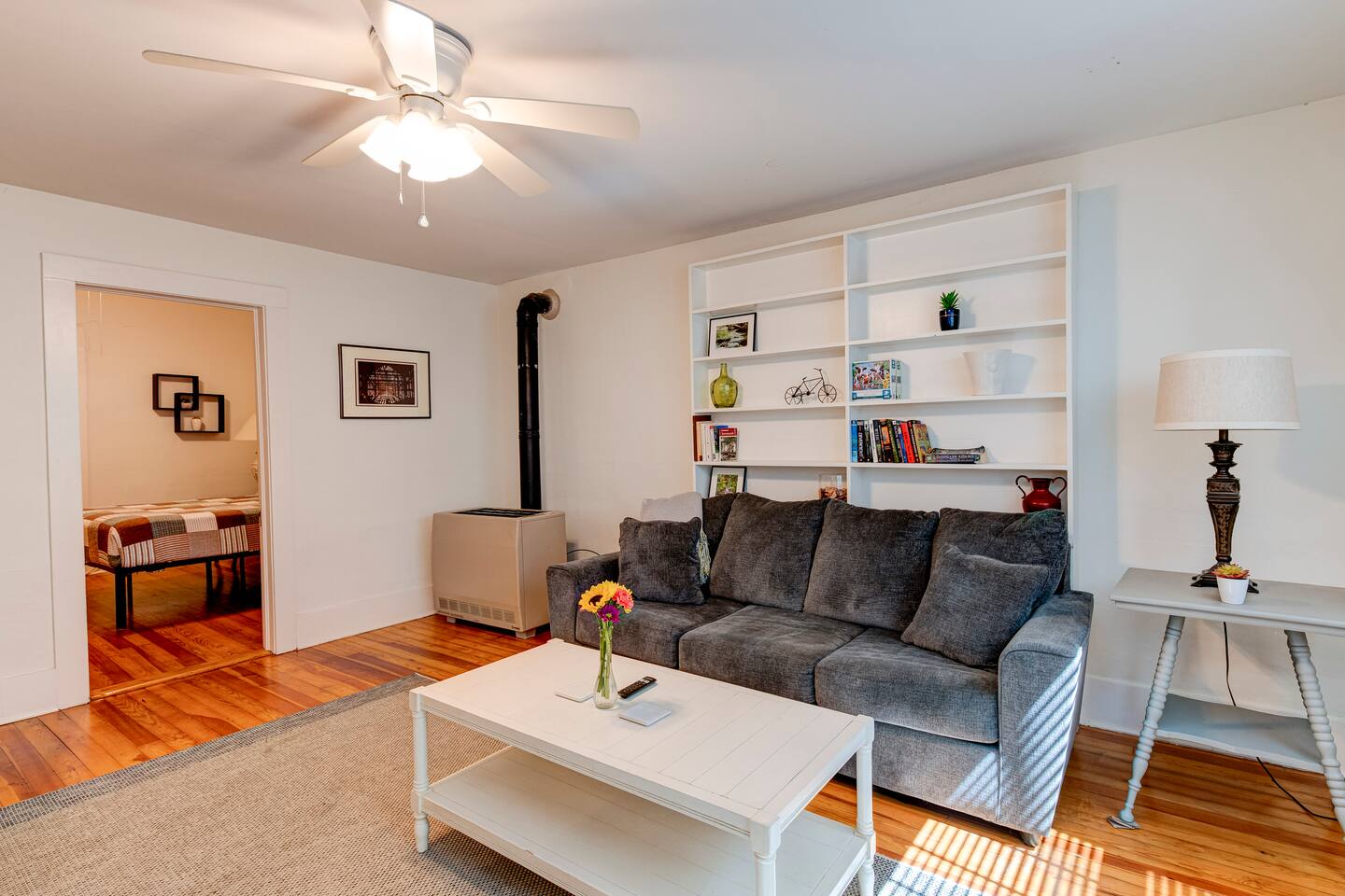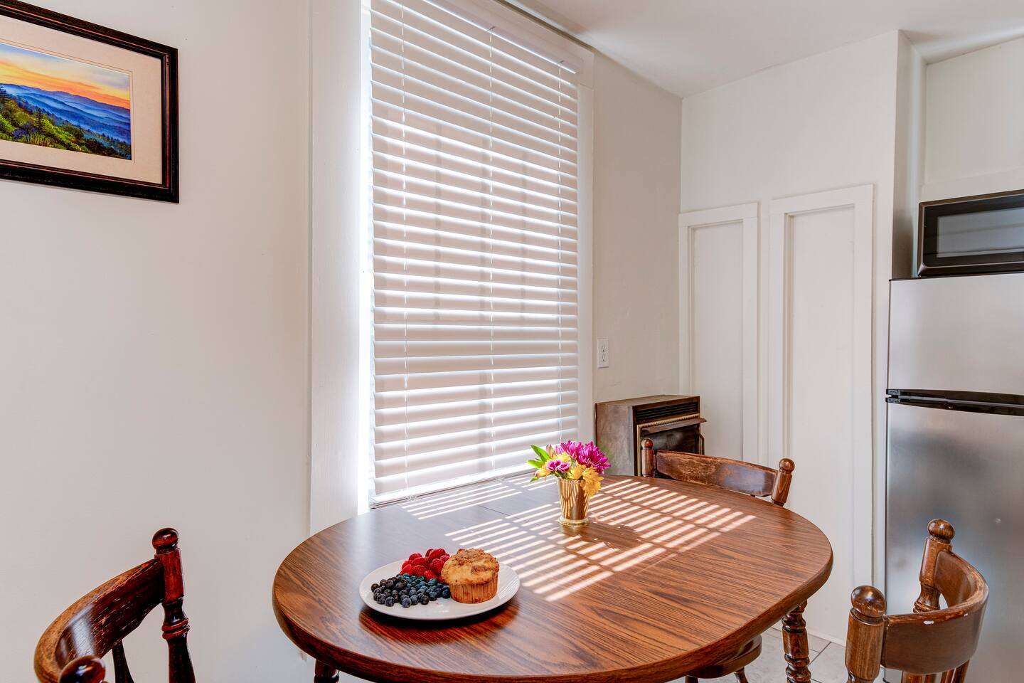 Charming mountain retreat in the heart of Black Mountain! This spacious one-bedroom suite is perfect for couples or solo adventurers. Located just steps from the Downtown Historic District, you can easily walk to famous shops, restaurants, and breweries. Enjoy a fully-equipped space with fast Wi-Fi and a cozy atmosphere. This queen bedroom suite is on the main level of the building, located in the back of the house.